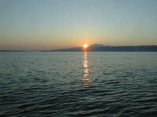 | 真野湾にある入海の定置網から望む佐渡の日の出です。1999.04.30撮影 |